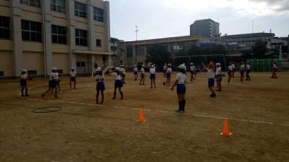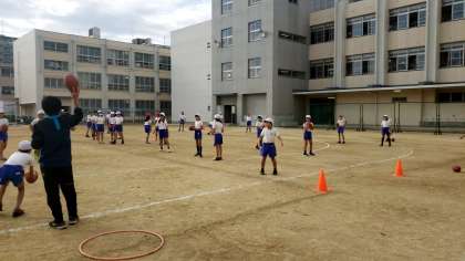 今日からはタグラグビーの学習です。まずは、楕円形のラグビーボールでパスの練習。