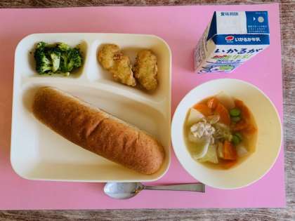 【ライ麦パン、白身魚のフリッター、スープ煮、ブロッコリーのサラダ、牛乳】
