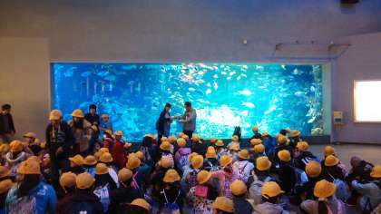 これから、水族館の中でグループ活動です。魚たちのショーを見ます。