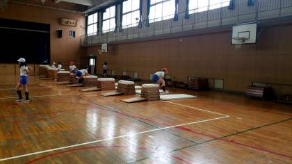 跳び箱の練習中でした。跳び箱を上手く跳ぶコツは、腕をついたときの体重移動です。