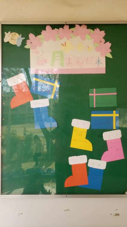 いつも職員室前の掲示板に読み語りの皆様が季節にあった掲示物を作っていただいております。