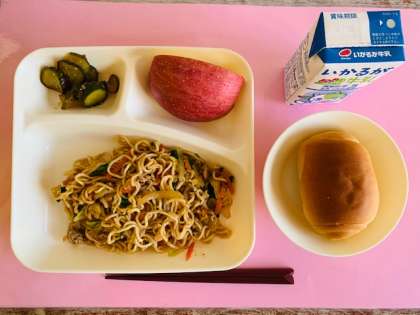 【黒糖パン1/2、オイスターソース焼きそば、きゅうりの中華あえ、りんご、牛乳】