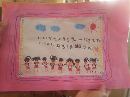 新高幼稚園の子どもたちが、小学校へ手紙を持ってきてくれました。丁寧にがんばって書いてくれた手紙です。1年生の子どもたちも、感心していました。