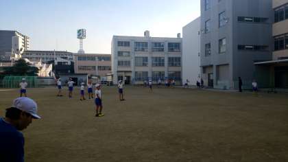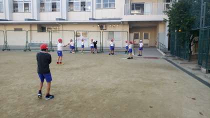 運動場では、運動クラブが活動中。今日は、プラスチックバットを使って野球に取り組んでいます。