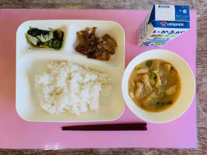 【ごはん、豚肉のしょうが焼き、さつまいものみそ汁、きくなとはくさいのごまあえ、牛乳】