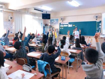 4年生は食に関する授業で、おやつに含まれている砂糖について学びました。おやつにどのくらいの砂糖が含まれているのか、1日にとってもよい砂糖の量などを知り、おやつのとり方について考えました。