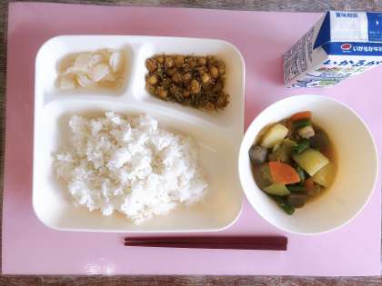 【鶏肉と野菜の煮もの、じゃこ豆、かぶのゆず風味、ごはん、牛乳】