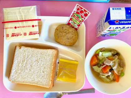 【食パン、アプリコットジャム、とうふハンバーグ、カリフラワーのスープ煮、スライスチーズ、牛乳】