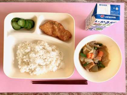 【ごはん、たらのフライ、豚肉とあつあげの煮もの、あっさりきゅうり、牛乳】