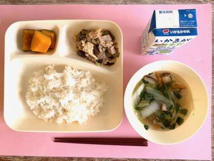 【ごはん、豚肉と干しずいきのみそ煮、すまし汁、焼きかぼちゃ、牛乳】