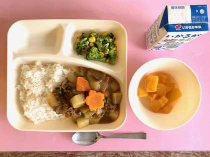 【冬野菜のカレーライス、ブロッコリーとコーンのサラダ、黄桃(缶詰)、牛乳】