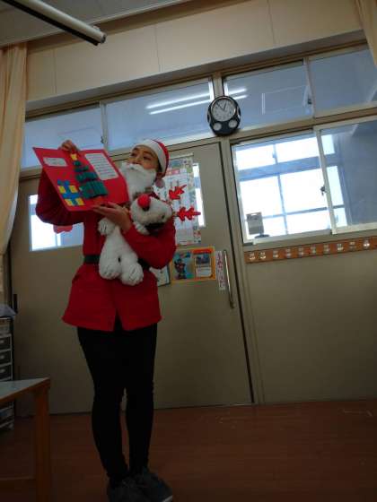 今日の給食時間に1年1組の教室になんとサンタクロースがやってきました。