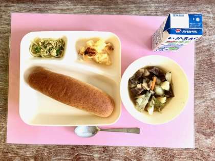 【ライ麦パン、ポトフ、カラーソテー、桃のクラフティ、牛乳】