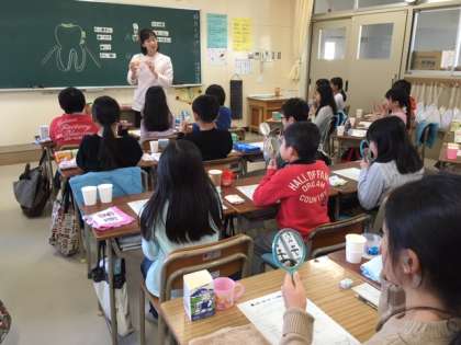 まずは教室で、歯のはたらきやむし歯の原因について勉強しました。