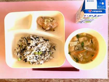 【栄養たっぷりえだまめひじきご飯、さけのさわやかレモン焼き、冬野菜のみそ汁、牛乳】