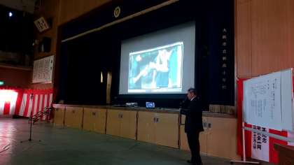 講堂に戻って当時の山内校長先生が用意してくださったビデオ観賞。林間、修学旅行、運動会や卒業生を送る会の様子を見ました。懐かしいですね。