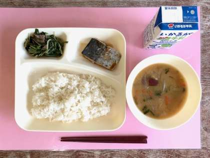 【ごはん、さごしのしょうゆだれかけ、みそ汁、みずなの煮びたし、牛乳】