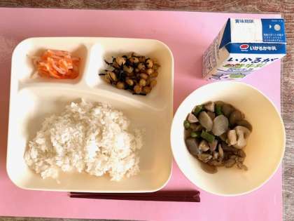 【ごはん、筑前煮、ひじき豆、紅白なます、牛乳】