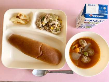 【ミートボールのケチャップ煮、ツナと野菜のソテー、焼きじゃが、黒糖パン、牛乳】