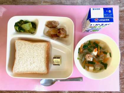 【食パン、バター、鶏肉のオイスターソース焼き、えびととうふのスープ、チンゲンサイのピリ辛あえ、牛乳】