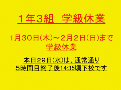 本日、29日(水)、1年3組では、かぜ様疾患による欠席児童が多数出たため、1月30日(木)から2月2日(日)まで、学級休業といたします。本日は、通常通り5時間目終了後下校しますが、いきいき活動への参加はできません。詳しくは本日配布の手紙でご確認ください。