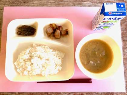 【ごはん、まぐろの甘辛焼き、豚汁、くきわかめのつくだ煮、牛乳】