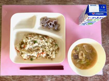 【鶏ごぼうご飯、みそ汁、焼きれんこん、牛乳】