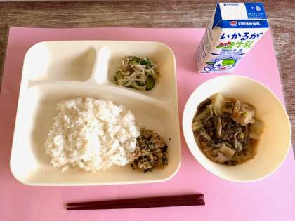 【ごはん、すき焼き煮、もやしときゅうりのしょうがづけ、ツナっ葉いため、牛乳】