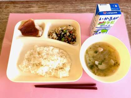 【ごはん、あかうおのしょうゆだれかけ、うすくず汁、高野どうふのいり煮、牛乳】