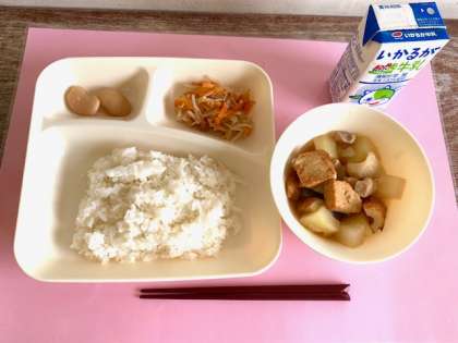 【ごはん、関東煮、もやしとにんじんの甘酢あえ、白花豆の煮もの、牛乳】