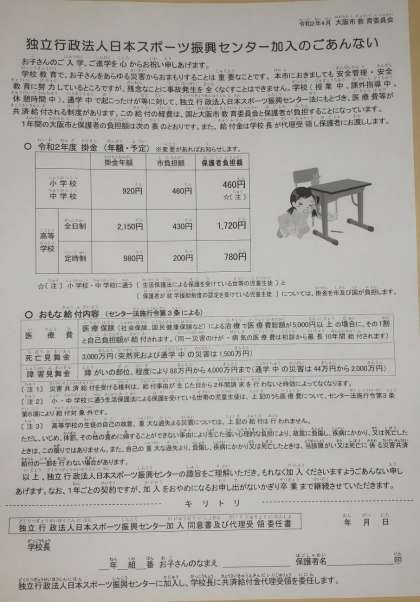 教科書等配付の際にお配りした「独立行政法人日本スポーツ振興センター加入のごあんない」(上の画像参照、またはここをクリック)についてのお知らせです。