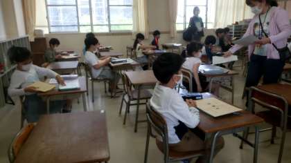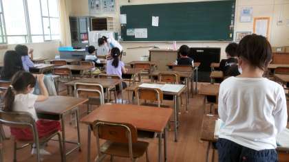 2年生、朝の会の様子です。しっかりと話を聞く態度は、新1年生のお手本にもなりますね。