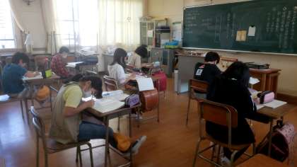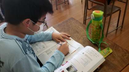 6年3組では、プリントを活用して算数の学習中。やっぱり、家で一人で学習するより、友達と一緒に取り組む方が良いですね。