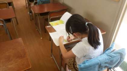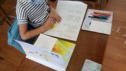 背景となるタケノコの絵。みんな上手にかいていました。思わずタケノコが食べたくなってきました。