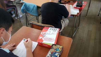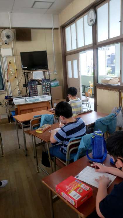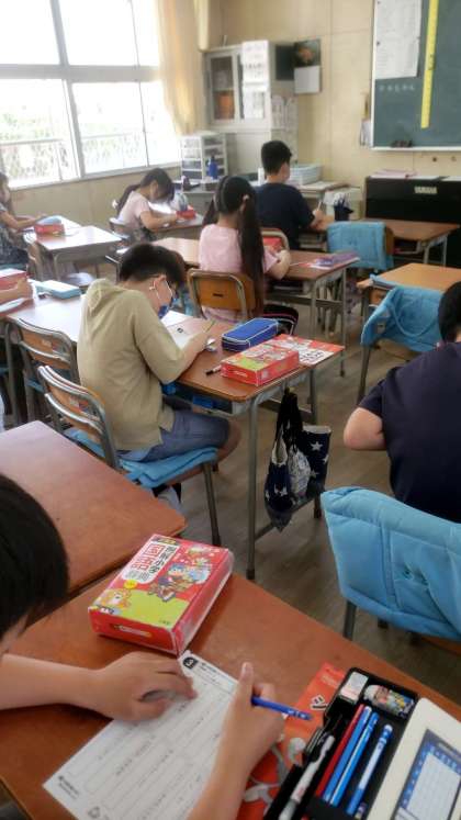 漢字の書き取りテストをしています。すらすら書けている人もいれば、頭をを抱えている人も
