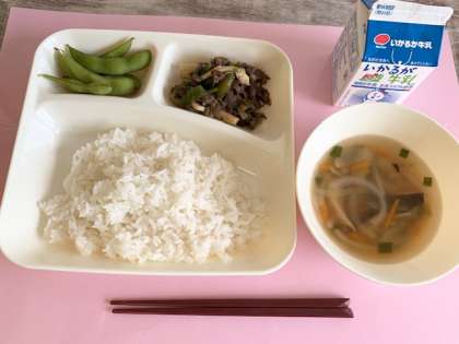 【ごはん、チンジャオニューロウスー、ハムと野菜の中華スープ、えだまめ、牛乳】
