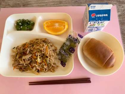 【黒糖パン1/2、焼きそば、オクラの甘酢あえ、オレンジ、牛乳】