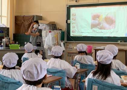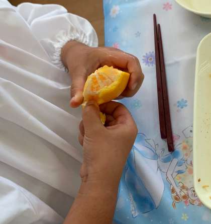 1年生は、オレンジの皮のむき方を担任の先生に写真を使って教えてもらい、頑張ってむいて食べていました。