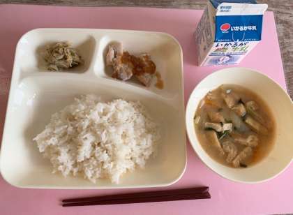 【ごはん、鶏肉のおろしじょうゆかけ、みそ汁、野菜いため、牛乳】