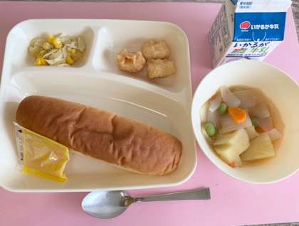 【大型コッペパン、アプリコットジャム、いかてんぷら、フレッシュトマトのスープ煮、サワーソテー、牛乳】