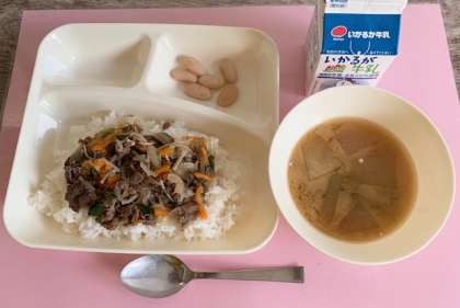 牛丼は、牛肉、糸こんにゃく、たまねぎ、にんじん、青ねぎ、えのきたけを甘辛く味つけし、煮ています。子どもたちに人気の献立です。