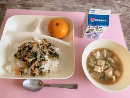 【豚ミンチとニラのそぼろ丼、オクラのみそ汁、みかん(冷)、牛乳】