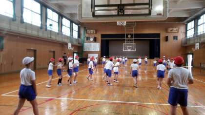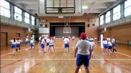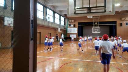 講堂でドッジボールをしています。よく見ると、ボールが2つ。色んな角度からボールがやってくるので、油断は出来ません。でも、大いに盛り上がっていました。