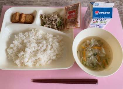 【ごはん、ゴーヤチャンプルー、すまし汁、あつあげのしょうがじょうゆかけ、牛乳】