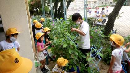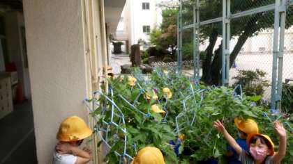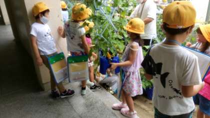 ここ数日雨が降り続いてましたが、今日は朝から曇り空。ずっと出来ていなかった朝顔の観察を今からします。大きく大きく成長している朝顔に1年生のみんなは、驚いたり、喜んだり、自慢したり…!(^^)!