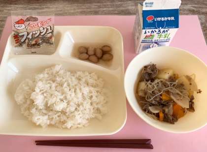 【ごはん、肉じゃが、とら豆の煮もの、アーモンドフィッシュ、牛乳】