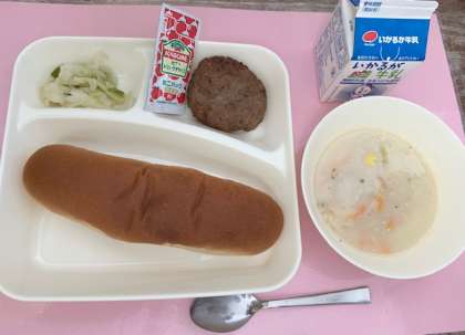 【黒糖パン、焼きハンバーグ、豆乳スープ、キャベツとピーマンのソテー、牛乳】