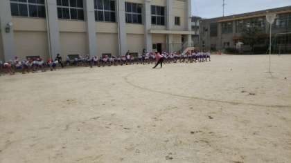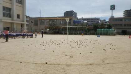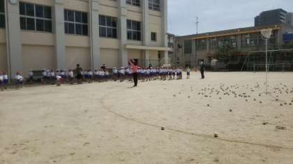 今日は運動会で行う玉入れの練習です。まずは、日陰でしっかりと準備体操を行っています。