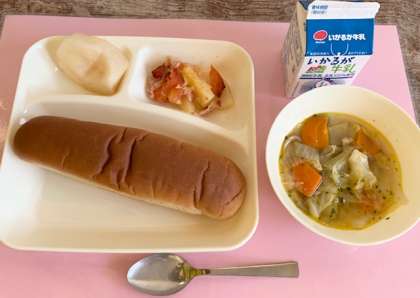 【黒糖パン、鶏肉とてぼ豆のスープ煮、じゃがいもとトマトのチーズ焼き、なし(二十世紀)、牛乳】