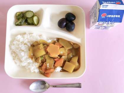 【チキンカレーライス[米粉]、きゅうりのピクルス、ぶどう(巨峰)、牛乳】